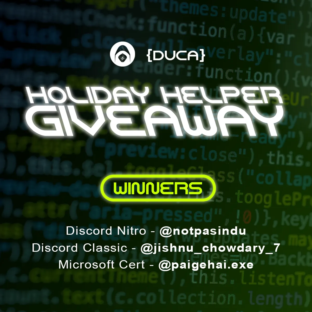 DUCA announces the Holiday Helper giveaway winners, celebrating students who scored Discord perks and a Microsoft certification, and thanking the community for enthusiastic participation support.