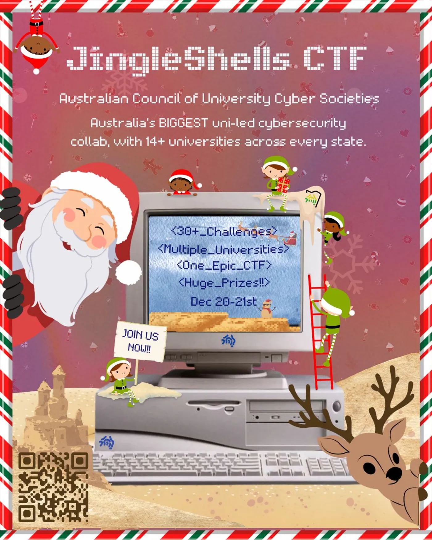 The Australian Council of University Cyber Societies (ACUCyS) Nation-Wide Christmas CTF is an exciting, collaborative cybersecurity competition uniting club execs and enthusiasts from universities across Australia. Slated for December 2025, our “Christmas Aussie Cyber” theme will challenge participants with 50+ original and revamped CTF problems across a spectrum of disciplines—reverse engineering, binary exploitation, OSINT, web, cryptography, Linux commands, and more.